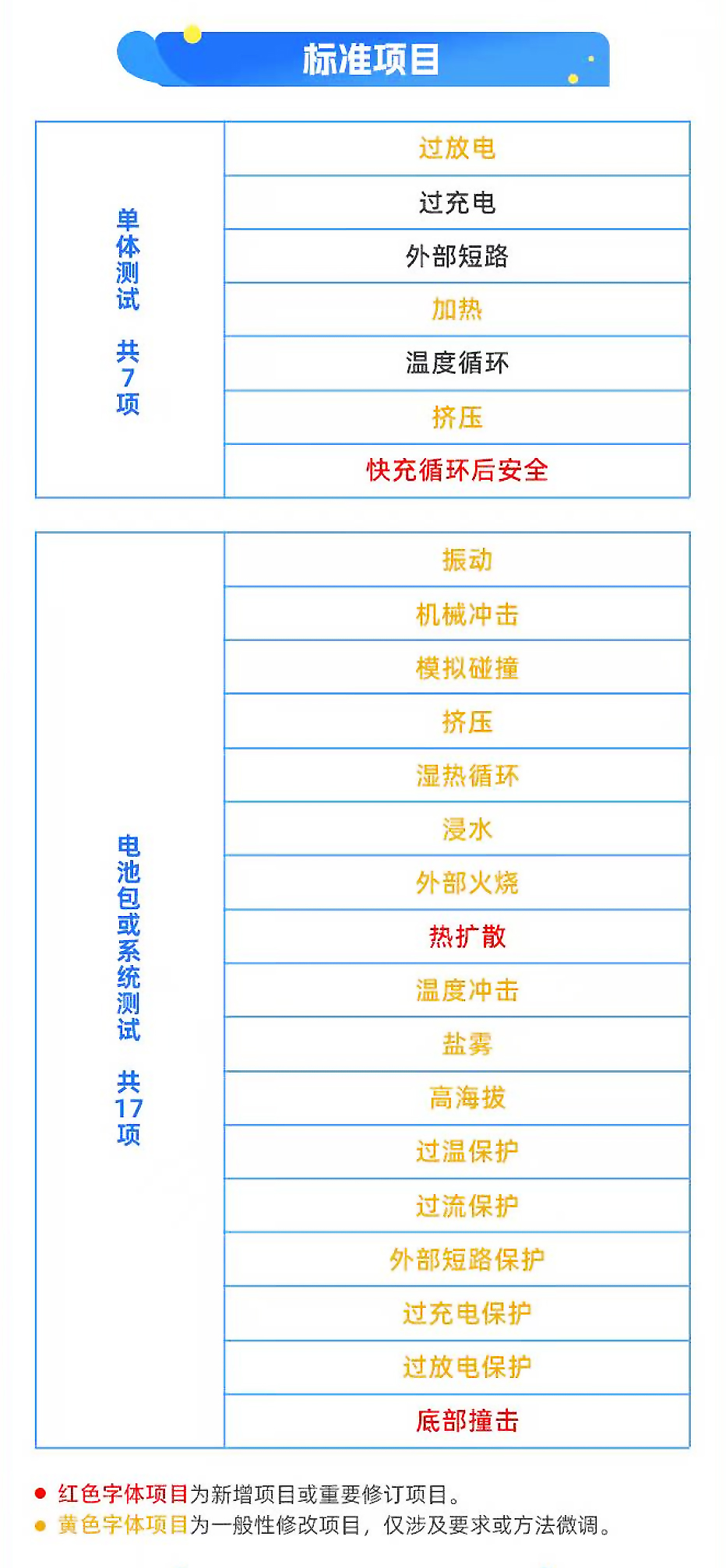 《電動汽車用動力蓄電池安全要求》強制性國家標(biāo)準(zhǔn),包括:7項單體測試、17項電池包或系統(tǒng)測試等內(nèi)容。